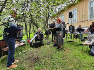 Nautittiinpa kevätriehassa keväästä ja hyvästä seurasta omenapuiden katveessa ja vanhan puukoulun idyllissä. – Kiitämme kaikkia mukana olleita talkoolaisia, ohjelmansuorittajia, myyjiä ja kävijöitä. Tunnelma oli iloinen ja kohtaamisista ja yhdessä tekemisestä saimme kukin hyvän mielen. Annetaan kesän nyt tulla!