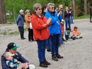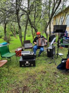 Myhäilevä herra kuvaa hyvin tunnelmaa kevätriehassa – sään koleudesta huolimatta meillä oli mukavaa!